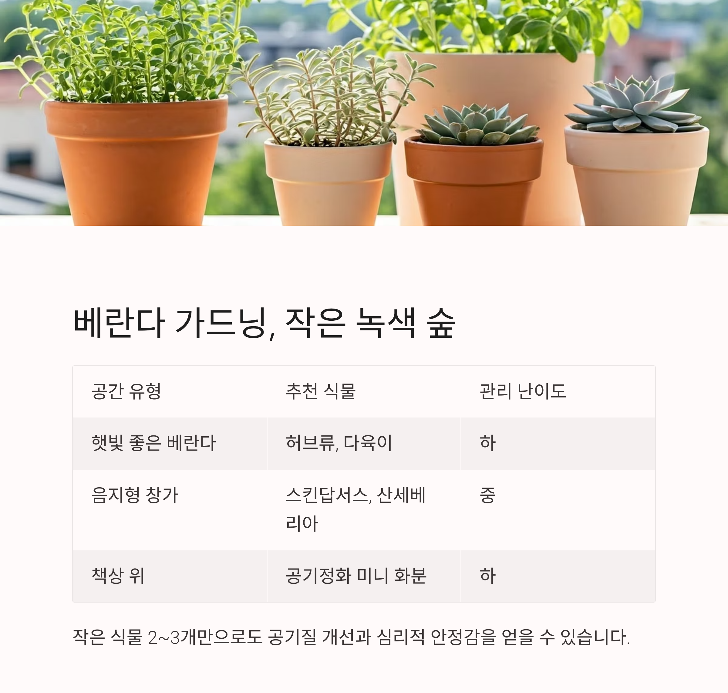 단 2~3개의 작은 식물만으로도 실내 공기질 개선 + 심리적 안정감을 얻을 수 있습니다.